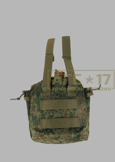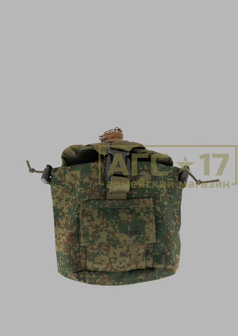 Регулировка объема: По горловине подсумка проходит эластичный шнур с пружинными фиксаторами. Это позволяет плотно зафиксировать как стандартную флягу, так и более объемный котелок, предотвращая дребезжание и выпадение.