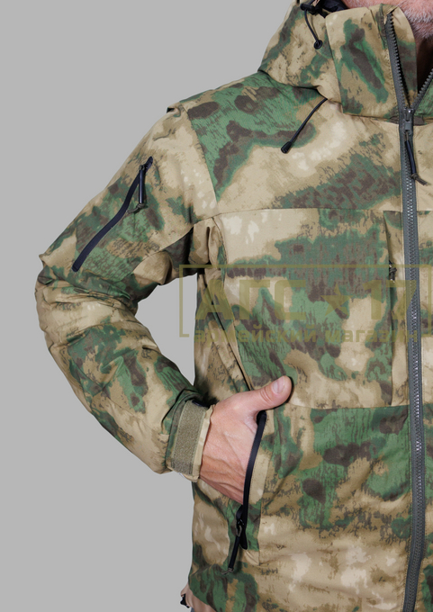 Функциональность: Модель оснащена застежкой на молнию под планкой, что добавляет удобство в использовании. Куртка имеет несколько карманов: нагрудные карманы под клапанами для защиты от дождя и снега и нижние утепленные карманы с застежкой на молнию. На правой полочке предусмотрен съемный чехол-окошко для бейджа и полукольцо для крепления пропуска. Также внутри находится карман на молнии для документов формата А4 с отделениями для ручки и паспорта. Спинка куртки удлиненная и имеет хлястики вместе с внутренней кулисой для регулировки объема по низу. Рукава регулируются хлястиками.