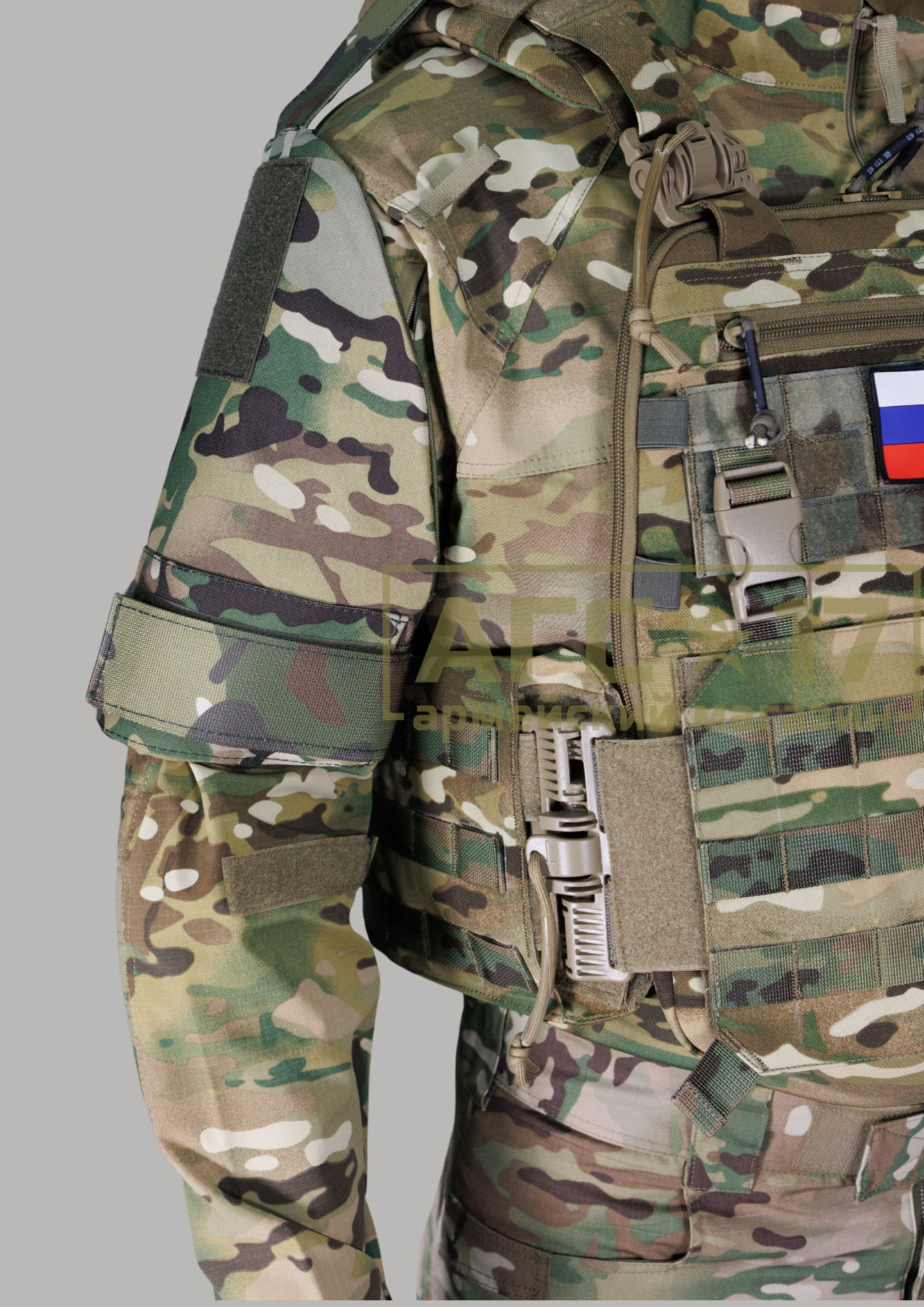 Основное преимущество заключается в универсальной системе крепления, что позволяет совместимо использовать защиту с большинством типов бронежилетов и плитоносцев. В верхней части изделия предусмотрена стропа с липучкой (velcro), которая надёжно фиксируется вокруг плечевой лямки. Такой подход обеспечивает удобство при использовании и лёгкость в эксплуатации, так как пользователю не требуется специального инструмента для установки. Также стоит отметить, что на боковой поверхности защиты расположена аналогичная стропа, обеспечивающая надёжную фиксацию изделия вокруг руки пользователя. Это позволяет избежать соскальзывания и гарантирует, что защита будет оставаться на своём месте даже в самых динамичных условиях. Защита оборудована баллистическим пакетом Бр1 СВМПЭ, что дополнительно обеспечивает защиту пользователя от возможных угроз. Этот компонент разрабатывался с учётом современных технологий и особенностей боевых действий, что делает его незаменимым для специалистов в области безопасности и армии.
