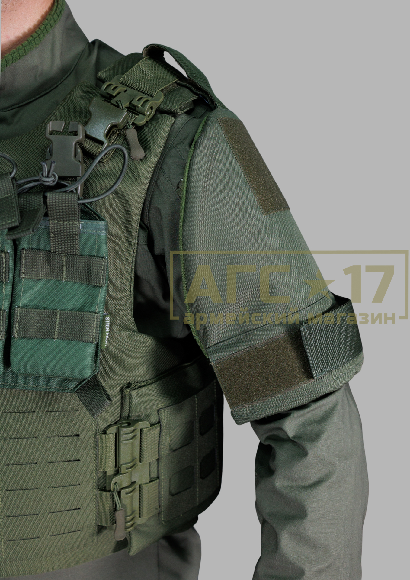 Функциональность: Увеличивает площадь противоосколочной защиты вне зависимости от положения тела. За счёт универсального крепления подходит к большинству моделей бронежилетов — фиксируется к плечевым лямкам с помощью стропы на velcro-липучке, дополнительно регулируется по объему руки для плотной посадки.